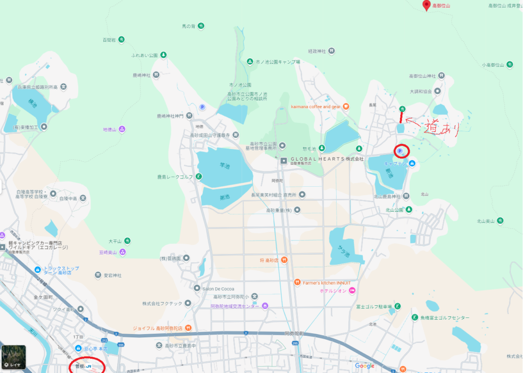 池の近くに有る丸に駐車場があります。登山口への道は分かりづらいですが、赤線の近くにあるはずです。探してみてください。