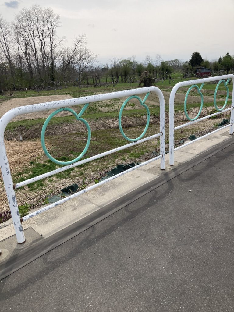 関西の方では、5月に雪を見ることがないため、山に積もる雪景色に見とれていました。歩道の柵はりんごが描かれておりました。さすが、りんご県。