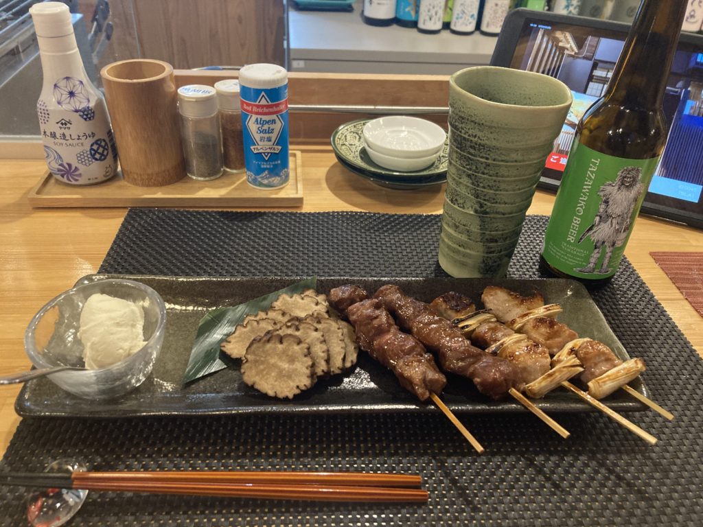 最後は夕食の田沢湖クラフトビールといぶりがっこ・豚串のセット。ビールラベルにはなまはげが描かれており、秋田感ましましです。