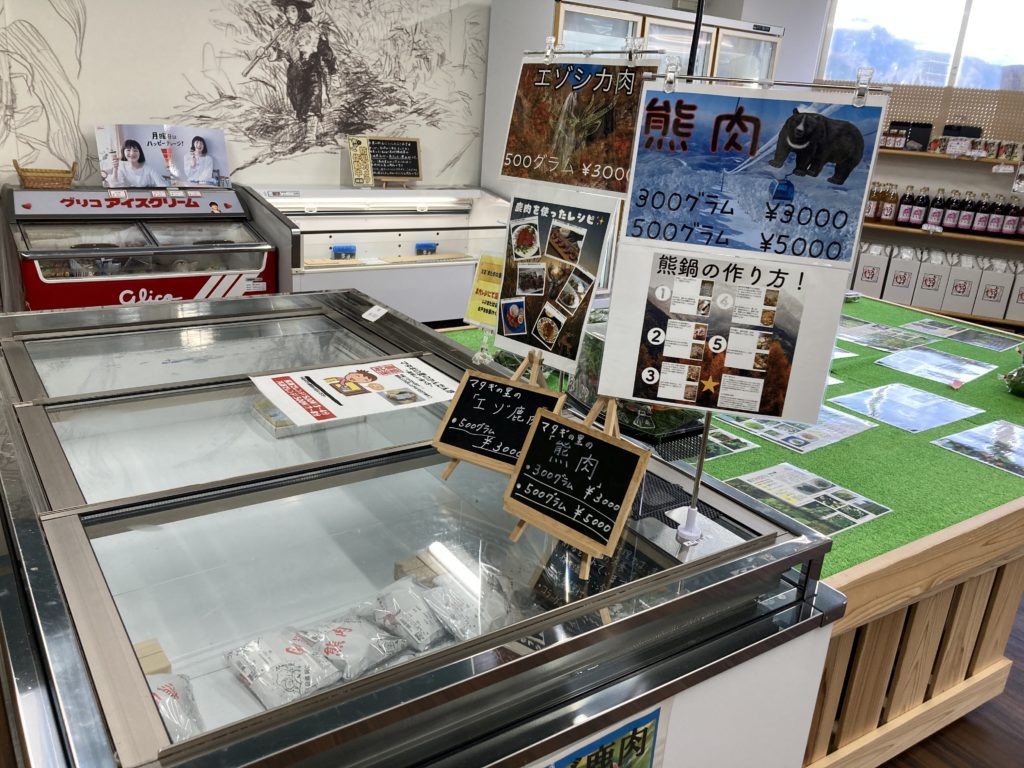 マタギとは、東北地方の方で狩猟をメインで暮らす人々のことを指しており、道の駅には「クマ・エゾシカ・兎」など珍しい肉類が置いてありました。